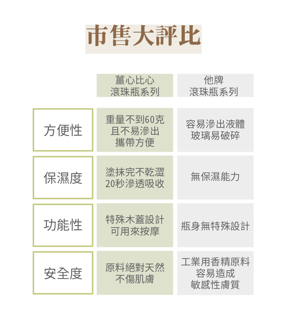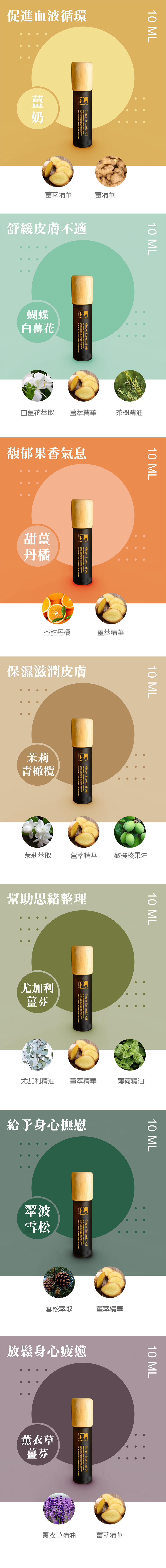 選用兩年以上的薑精油、複方植物基底油等成份。使薑精華滲入肌膚,木頭質感瓶蓋、深色玻璃瓶身,沉穩質感、設計方便隨身攜帶;不銹鋼滾珠減少塑料使用,精油流出順暢、不傷皮膚;可用木蓋輕按經絡及放鬆。